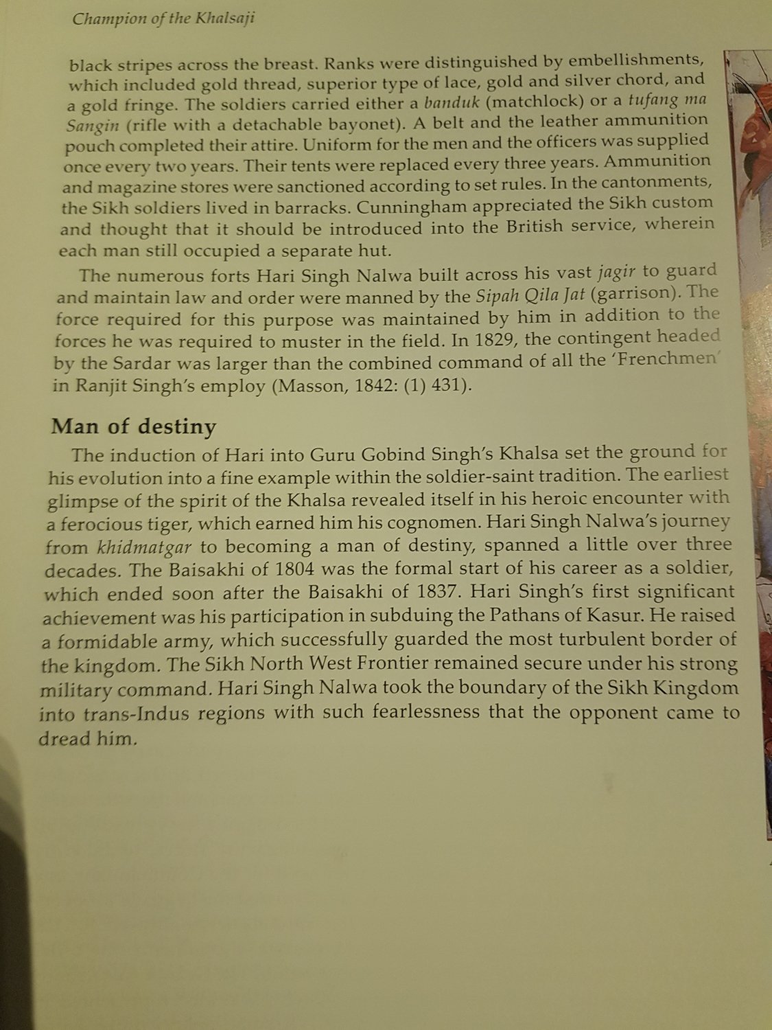 General Hari Singh Nalwa -19th century’s outstanding soldier, builder and diplomat Culture, News September 6, 2020September 6, 2020 indica ShareTweet By Sonia Dhami, a trustee at The Sikh Foundation International based in Palo Alto, California. General Hari Singh Nalwa’s (Above photo)successful military campaigns have literally established the current borders of modern Pakistan, Afghanistan, and India. At the beginning of the 19th century, both Kashmir and Khyber Pakhtunkwha were under Afghan rule. The Sikhs succeeded in wresting control of these territories from the formidable Afghans and established their rule. This passed on to the British till Partition in 1947, creating the nation-states of India and Pakistan. Preparation for this outcome was set in motion on the day of Baisakhi in 1801. Ten-year-old Hari from Gujranwala partook kande-di-pahul (the ceremony of initiation) and joined the fold of the Khalsa of Guru Gobind Singh. He was now transformed into Hari Singh. In Lahore, on the same day of 13th April 1801, the 21-year-old Ranjit Singh was anointed “Maharaja of Punjab”. Jamrud Fort 1930, Khanuja Family Collection. Together, Maharaja Ranjit Singh & his valiant general Sardar Hari Singh Nalwa, would create the first indigenous empire in the Punjab which would effectively stop the foreign invasions from the west, into the Indian subcontinent, which had continued unchecked for 800 years. Invaders had long poured into the Indian heartland through the Khyber Pass. Hordes traveled through Punjab to Delhi and beyond. Repeated attacks first from the Persians under Nadir Shah and later from the Afghan Durranis, continued to weaken the declining Mughal empire. A popular saying in 18th century Punjab was “Khaadha peeta laahey da baaki Ahmad Shahe da” (which means only what you eat and drink is yours the rest belongs to Ahmad Shah) aptly summed up the hegemony these foreign invaders enjoyed. In the 18th century, Sikhs were widely persecuted under Mughal rule. They literally carried a price on their heads. Overcoming the challenges, the community regrouped and gained strength by organizing itself into 12 confederacies known as misals, each controlling independent territory. As the booty laden invaders returned home, the Sikhs would attack and harass them. By the end of the 18th century, history turned a page. Through sheer grit, perseverance and faith the Sikhs turned from being the oppressed themselves to protectors fighting for the weak. Stamp with the painting of Hari Singh Nalwa. At the beginning of the 19th century, a sovereign kingdom of the Sikhs emerged under Maharaja Ranjit Singh. Expanding over the next decades, its territories at its zenith extended to the Khyber Pass in the northwest, to Kashmir, Ladakh & Mandi in the northeast, uptil Sindh & Rajputana in the south and the Sulaiman range in the west. Hari Singh joined the service of Maharaja Ranjit Singh at the young age of fourteen years. Rising rapidly in the ranks he saw action in Kasur & Multan excelling in the battlefield against the Afghans on these fronts. In 1821, General Hari Singh Nalwa was made the Governor of Kashmir and later of Peshawar and Hazara. He was born in 1791 in Gujranwala. It is not clear as to how he came to be known by the cognomen of “Nalwa” though he never officially used it. He is known to have recounted the story when he killed a tiger with his bare hands, to the Austrian traveler Baron von Hugel (1795-1870) author of “Travels in Kashmir and the Punjab” published in 1840. His grandfather joined the Khalsa confederacy of the Sukerchakia misal. His father Gurdas Singh died fighting the Afghans when Hari Singh was only 7yrs old. His mother, Dharam Kaur ensured he was educated in both Persian and Gurmukhi. Perhaps this influenced his belief in encouraging the education of girls. Endeavoring to be a “sant-sipahi” (saint soldier) he also became skilled in horse riding, swordsmanship and the art of warfare. Over the course of his lifetime, he took part in almost a dozen major battles including Kasur(1807), Sialkot (1808), Attock(1813), Multan(1818), Mankera(1822), Nowshera(1823), Sirikot (1824) and Jamrud (1837). Nineteenth-century poets like Qadir Baksh( Kadaryar), Hari Chand & Ram Dayal have eulogized him making his life a popular theme for martial ballads even today. Hari Singh Nalwa’s many military achievements have overshadowed his multiple talents. With astute diplomacy, intellect, vision, and compassion he turned victory in battle into sustaining success. As Governor of Peshawar and Hazara he paid attention to the economic development of the region under him. He established a mint of the Lahore Darbar to facilitate revenue collection in Kashmir and Peshawar. Coin issued by General Hari Singh Nalwa, Classical Numismatic Group, Inc. In 1822, he built the fortified town of Haripur, the only planned town in the 19th century in the region. He settled Khatri traders and developed it into a major trade center. He introduced citrus farming in the region and supported it by laying out a canal system to feed the villages surrounding Haripur. Named the Rangila canal it was subsequently developed, further by the British. Caring for the needs of all religious groups he built a temple, gurudwara and mosque in the town. Hari Singh was also a prolific builder. He built 26 forts to safeguard the region including the Harkishengarh fort near Haripur & the Bala Hissar fort at Peshawar. He also laid the foundation of the Fatehgarh fort at Jamrud. Some 56 buildings including forts, towers, samadhs, bungas, dharamsalas, havelis, temples, mosques, gurudwaras, tanks and gardens are credited to him. In his hometown of Gujranwala, he oversaw the construction of an impressive samadh (funerary monument) of Sardar Maha Singh, father of Maharaja Ranjit Singh. He also constructed another residence for his family, which is a fine example of Sikh architecture. His haveli in the Katas Raj temple complex, serv