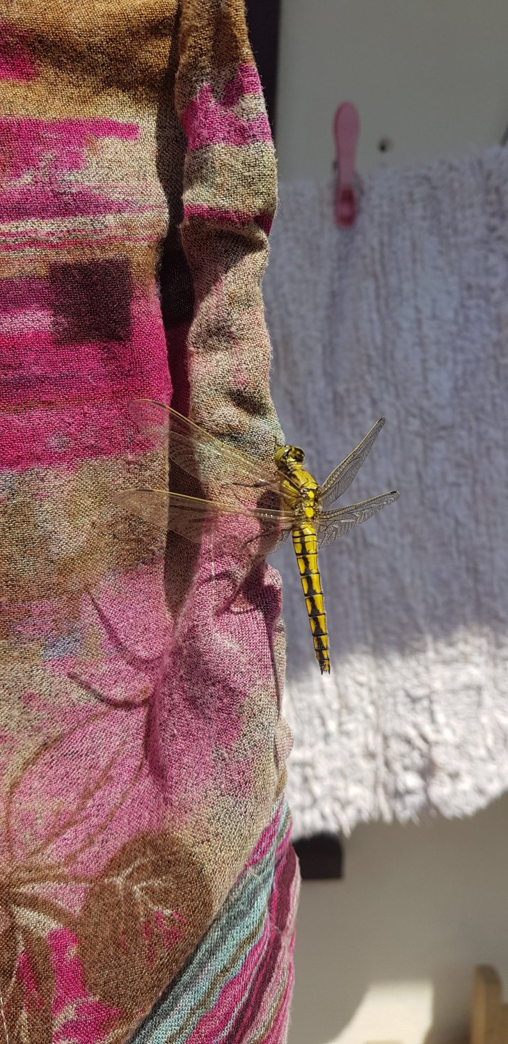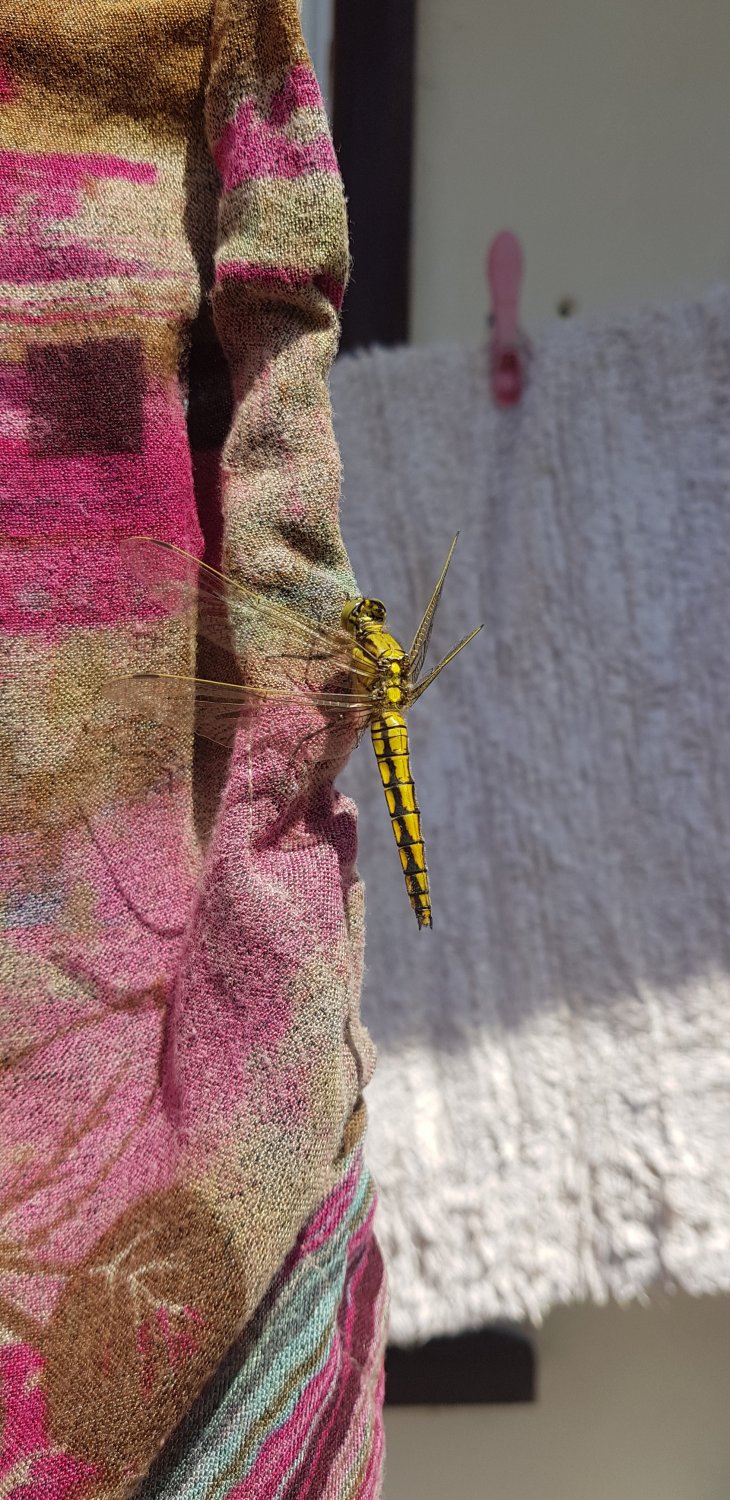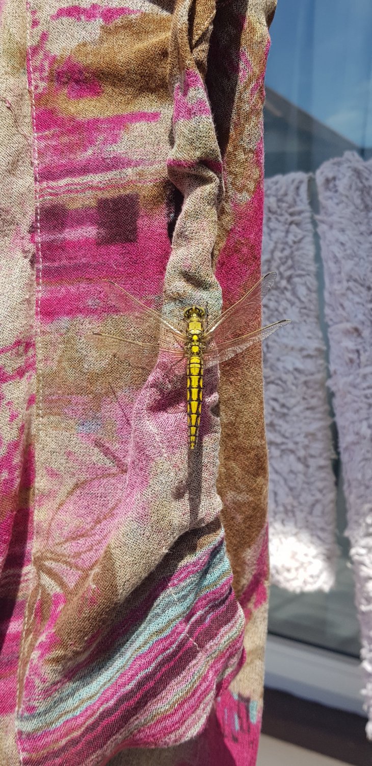 Really nice weather out there. Found this insect on my mums salwar suit in the garden lol Is it a dragon fly? It was quite big for a insect like the size of my index finger. Not sure what it was though.