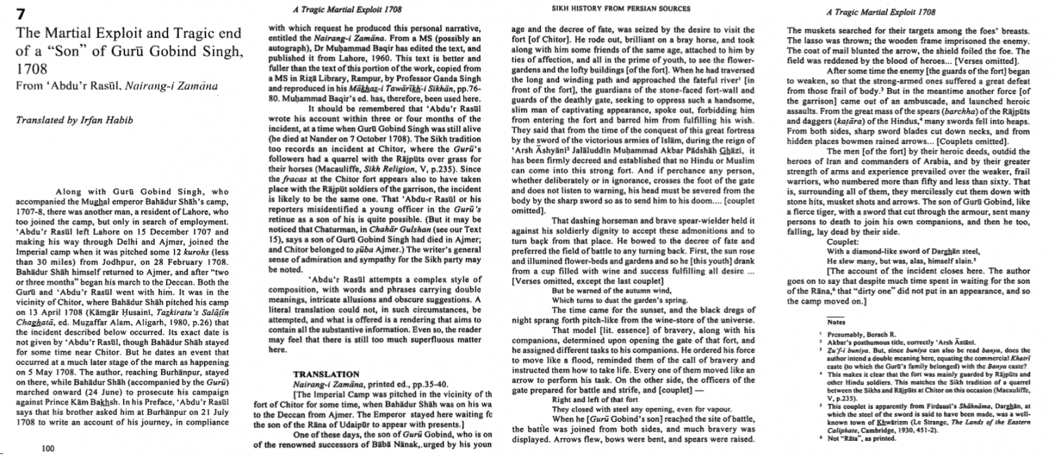 Ganda Singh mentions this adopted son of Guru ji in his footnotes of Sainapati's Gursobha. The adopted Zorowar Singh sometimes has been confused with Sahibzadha Zorowar Singh. The adopted son was one of the few that actually managed to fight his way out of the cordon placed around Chamkaur.